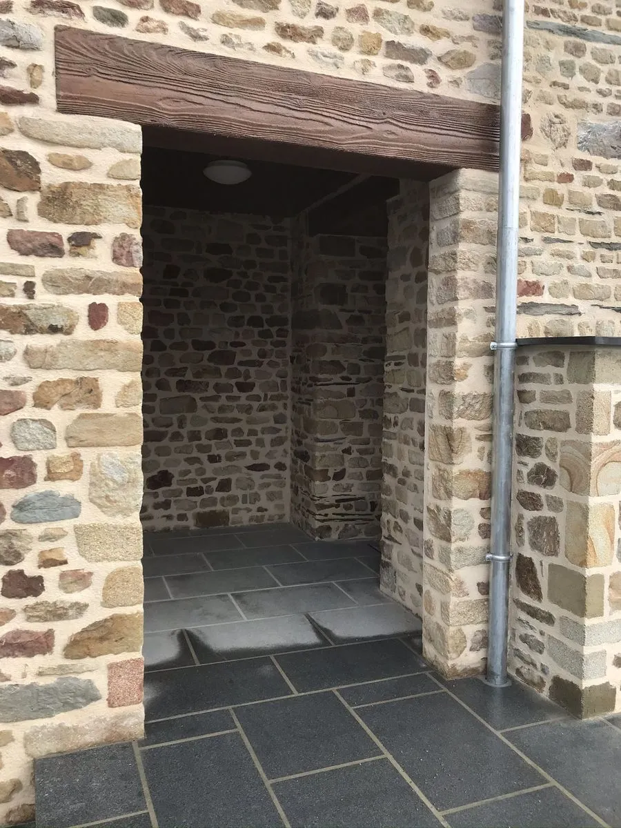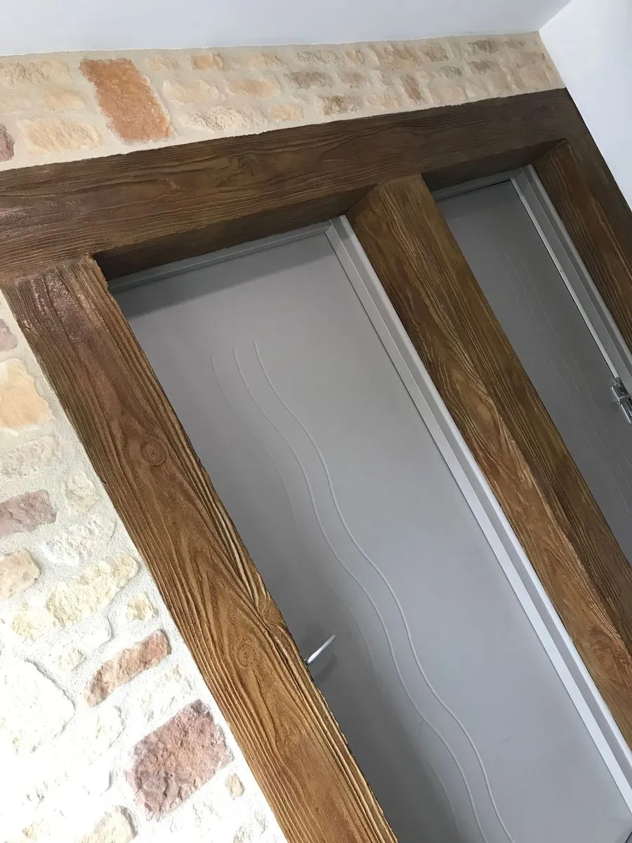 Notre mission consiste à couler et talocher votre linteau en béton, appliquer des colorants sur sa surface pour la durcir, effectuer un lissage, appliquer un démoulant sur le béton frais et y impremer des motifs et formes d'imiattion bois à l'aide de moules spécifiques et pour finir la mise en place d'une couche de vernis.
